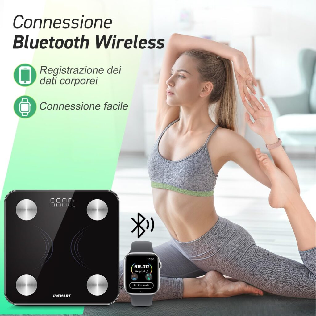 INSMART bilancia pesapersone digitale smart con Bluetooth e bioimpedenza. Ideale per monitorare peso, massa grassa e forma fisica.
