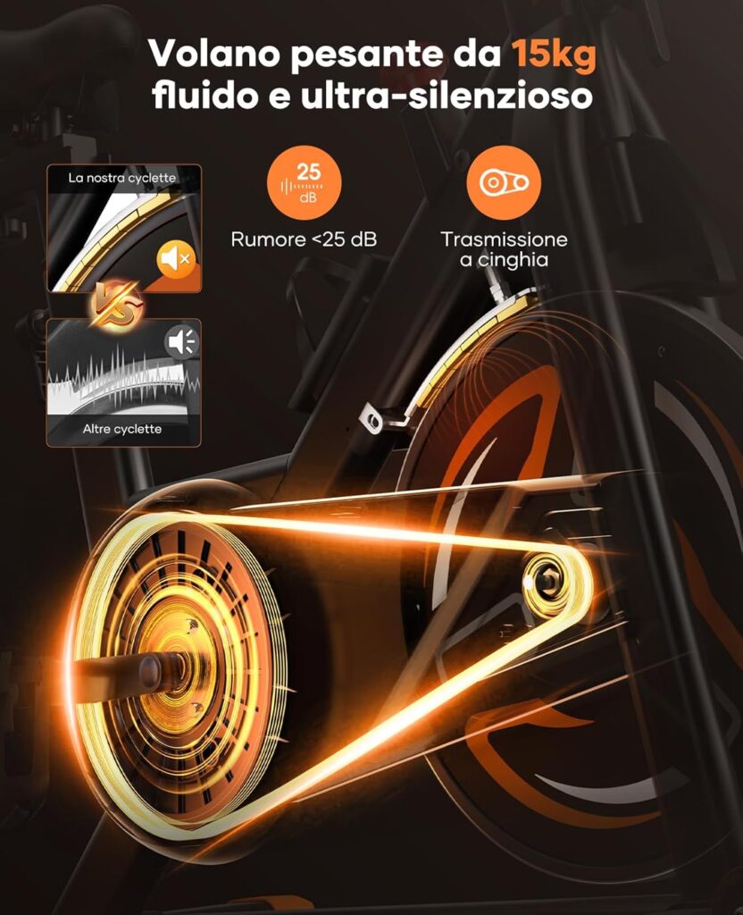 Grazie alla resistenza magnetica, al volano da 15 kg e alla compatibilità con app fitness come Zwift e Kinomap, offre un allenamento completo e silenzioso direttamente a casa.